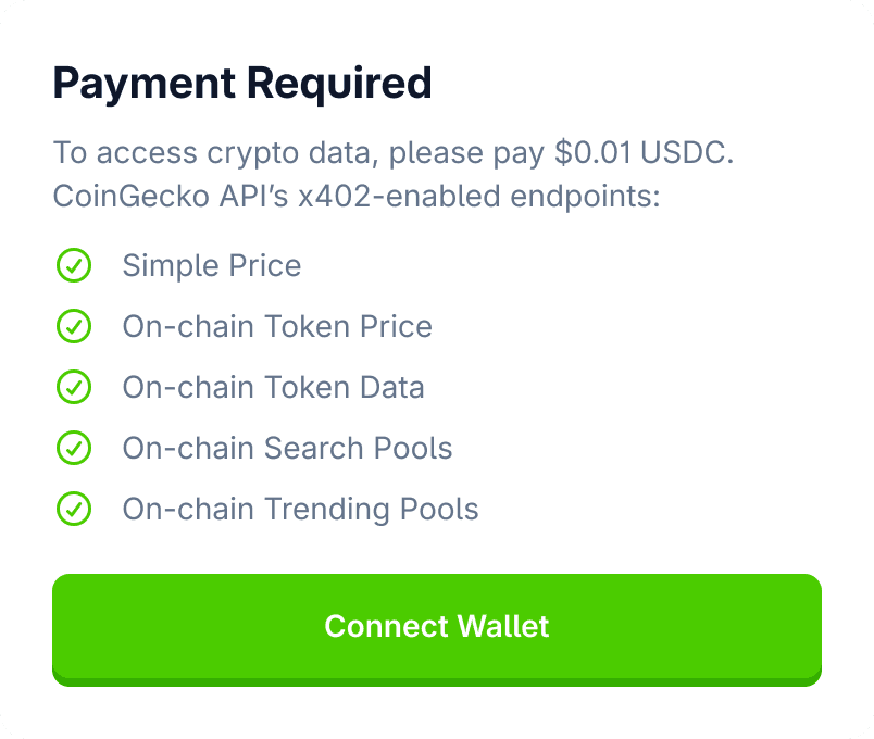 Give your AI agents instant access to crypto data without the API keys or account setups. Pay directly with USDC for the calls your agents make.