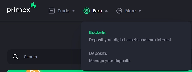 On the main page of Primex Finance, locate the header menu and click on the "Trade" button to navigate to the Buckets Page.