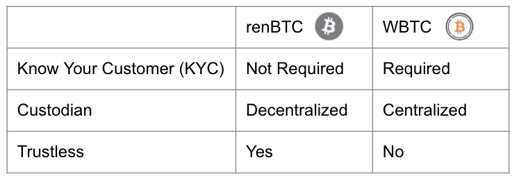 Although there are other synthetic assets that help bridge the value of bitcoin to the Ethereum network such as WBTC, renBTC differentiates itself from WBTC through some of its features.