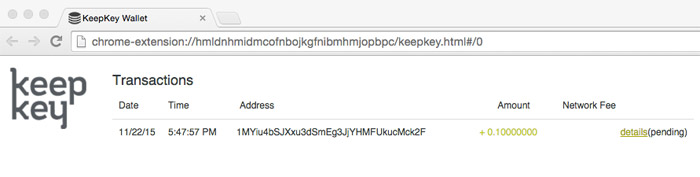 The process of receiving bitcoins is the same as that with any other wallet. I then proceeded to return the bitcoin to test the security credentials. This is where I was not too happy with the user experience. Whenever I navigate to another tab on Chrome to double check whether I have copied the address correctly, the wallet transaction data—such as the Bitcoin address and transaction amount—disappears. I have to click on the KeepKey icon at the menu bar to begin the process again.