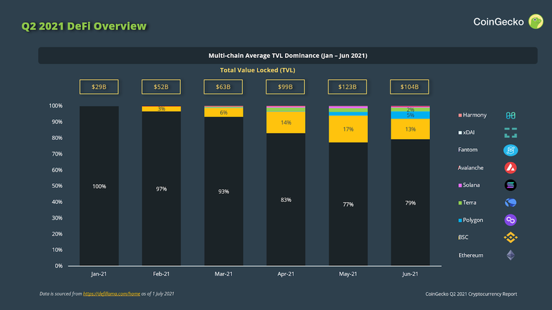 Despite the 65% total TVL quarterly growth, Ethereum Ethereum saw its TVL drop from 93% to 79% in Q2. Cheaper alternatives such as BSC and Polygon are slowly taking over.