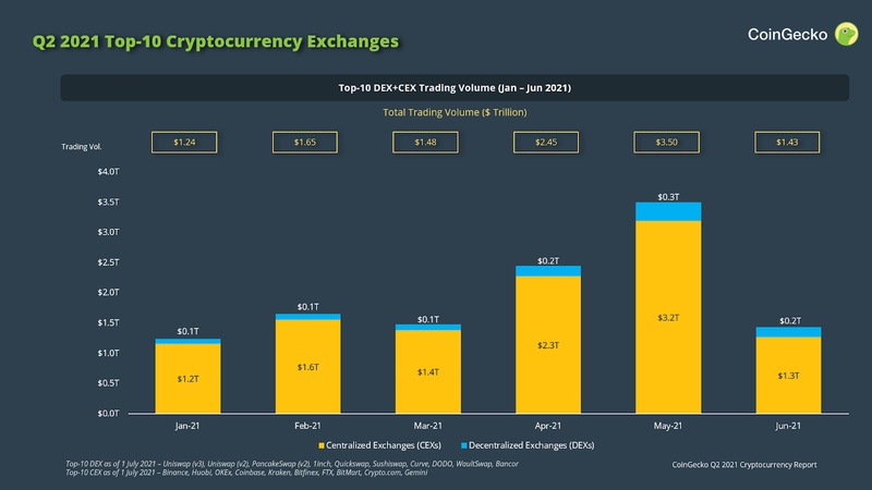 However, the total trading volume of both exchanges has decreased by nearly 60% in June, ending the quarter with $1.43 trillion, which is $2.1 trillion lower than May.
