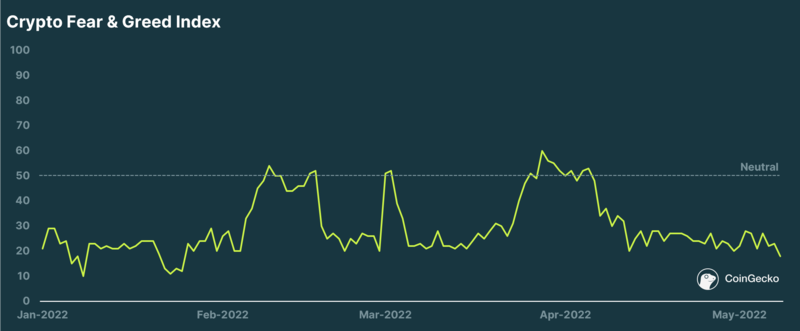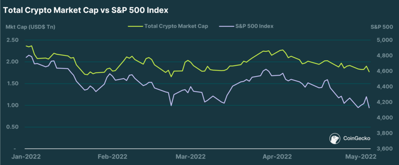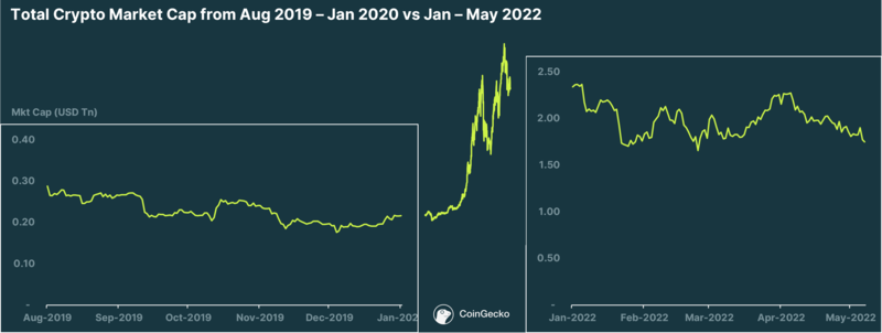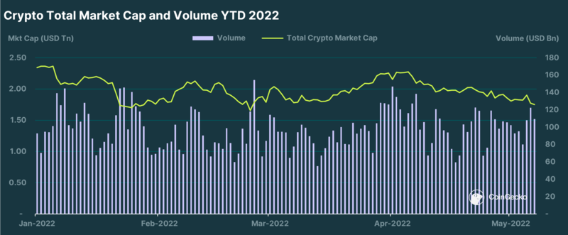 Announcement post-FOMC meeting last week (3rd - 4th May) sent equities markets and crypto on a “relief bounce”, on news of a 50bps rate hike and the start of quantitative tightening (QT) in June. However the bounce was short-lived, lasting only a day before taking a big tumble straight after. A very solid jobs report published on Friday failed to arrest the dip, which extended into the weekend. At the point of writing, the market has now dipped to its YTD low at $1.62T.