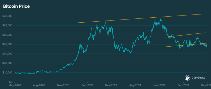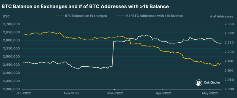 This is re-affirmed by taking a look at the amount of BTC remaining on exchanges. Since the start of 2022, there has been a net outflow of ~179k BTC from CEXes, and a corresponding large jump in BTC addresses with ≥1k BTC balance. Despite large players such as MicroStrategy and the Luna Foundation Guard (LFG) gobbling up BTC in March and April, BTC traders have continued to withdraw their tokens from exchanges. While this could be seen as a hodl strategy against uncertainty, it definitely hurts liquidity on markets. Lower liquidity on markets decreases the chances of prices breaking past resistance, while also at the same time weakening support levels.