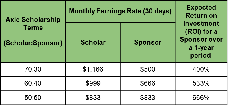 To provide some context, here is an example of the expected returns for Axie Sponsors and Scholars. Our assumptions are as follows:
