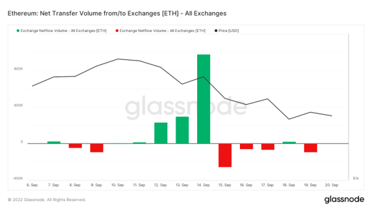 As the Merge day was finally set, traders had already begun making their moves. Even days before the event was slated to occur, ETH inflows into centralized exchanges were starting to pick up, culminating in over 980k ETH (~$1.6B) being moved onto exchanges on the eve of the Merge, the highest net inflow since 2016.