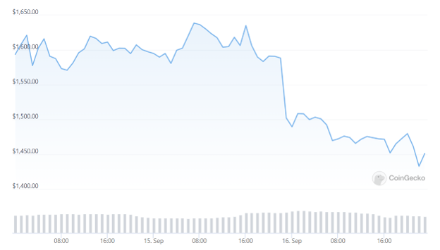 Though most crypto assets managed to stem the bleeding over the weekend, the carnage resumed almost instantly on Monday. The pre-emptive sell-off continued for BTC and ETH, as many were expecting the worst from the Fed and probably more. Even as US equities mounted a comeback to wrap up the day in the green, Ether prices nosedived by 9%, plunging to as low as $1,280. As the Fed’s decision drew closer, ETH remained in the $1,300 range - but not for long.
