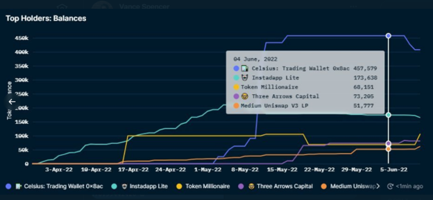 As of May 17th, Celsius reported that it has $11.8B+ in assets, with 2M+ community members. However, an on-chain sleuth has pegged their position as-of June 11th at $3.8B in assets and $1.18B in liabilities, following significant decrease in crypto prices and reports of significant withdrawals from Celsius.