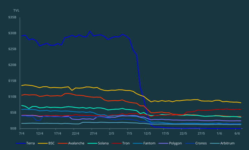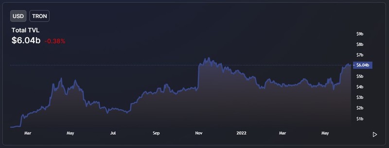 With the Terra fallout dominating crypto news several weeks ago, Tron had somewhat quietly climbed to third largest chain by TVL and has remained there since unseating Avalanche’s spot on 18th May. It now has a TVL dominance of 7.4%, behind only BNB (7.9%) and Ethereum (59.5%).