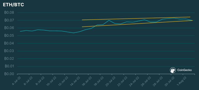 All these positive factors provided additional fuel for the continuation of the relief rally for the day. Strangely enough, despite the US economy contracting for the second straight quarter (-0.9% GDP at an annualized period for Q2), investors were left unperturbed. We explore more on this below. ETH, in particular, is still outperforming BTC (reaching $1.78k) as ETH/BTC consolidates at the 0.07 range, looking for an opportunity to break out.