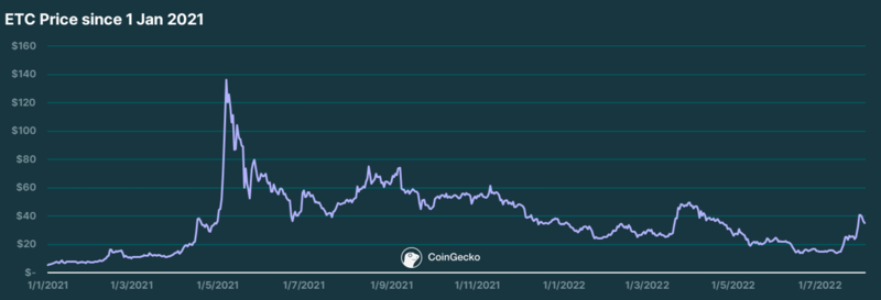 Thus far, Ethereum Classic (ETC), the “original” Ethereum chain, seems to have been the largest beneficiary of this conundrum. Since April 2021, hashrate on ETC has experienced a massive jump, tripling within a few months and is now sitting at above 30TH/s. The price of ETC though, is a slightly more complicated story.