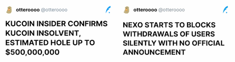 FatMan has been at the forefront of the Terra FUD, but another anonymous Twitter account, otteroooo, has grown in spades (which has since been deactivated) to capture other segments of the Terra fallout. The account claims to be the front for a group of on-chain sleuths. In particular, they have been directing their efforts to spread FUD about Nexo and KuCoin and their supposed insolvency issues.