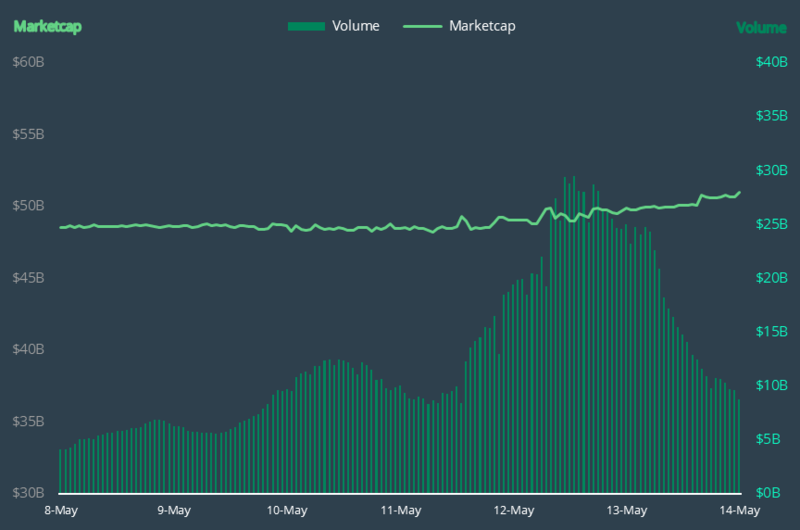 Over the course of 9 May to 13 May, USDC saw its marketcap increase by $1.4 billion. This was quite a sharp increase, and has only continued to grow as the week wore on. As of today (18 May), USDC now boasts $52.3B in marketcap, close to its all-time high. Meanwhile, daily volume jumped by ~480% from an average of $6 billion to over $29 billion.