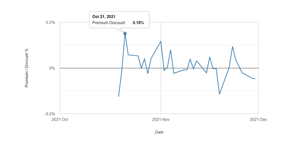 Moreover, like all ETFs, $BITO is prone to mispricing. It is impossible to achieve perfect market tracking since share prices do not necessarily trade according to its underlying assets. For example, $BITO’s highest premium i.e. market price relative to its NAV was 0.15% on 21 October 2021, likely driven by ‘institutional FOMO’ after being newly created.
