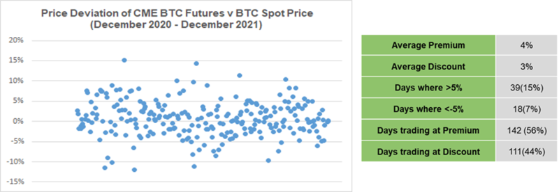 If we look at the closing price deviations for CME BTC futures contracts, they tend to be significant and occur quite often.