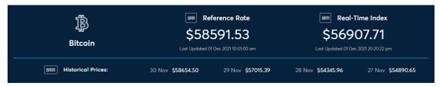 2 The BRR is a daily reference rate that aggregates the prices of BTC from major exchanges during a specific one-hour calculation window. This one-hour window is then partitioned into 12, five-minute intervals, where the BRR is calculated as the equally-weighted average of the volume-weighted medians of all 12 partitions. The result is the US dollar price of one Bitcoin as of 4 pm London time.