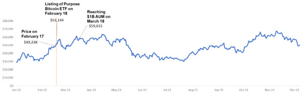While there appears to be some strong correlation here, it is worth remembering that on March 18, 2021, Bitcoin’s market cap was $1.1T. Factoring in price impact variables like liquidity, spreads, macroeconomic factors, etc, it is extremely unlikely that an accumulation of $1B worth of Bitcoin over a month, was the sole factor for the price increase. A more reasonable assumption is that the first BTC ETF was seen as a bullish event for the market.