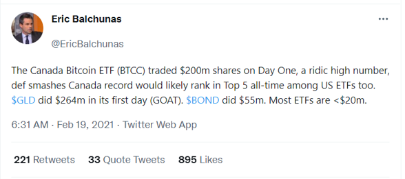 Within a day of its launch, Bitcoin’s closing price jumped by $3k. At the same time, $BTCC saw huge interest and traded $200 million shares on its first day. According to Balchunas, Senior ETF Analyst for Bloomberg, this is significant because it puts it in the top-5 of all time for first-day demand for ETFs (including the US).