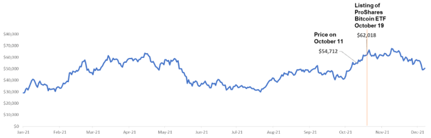 In the week before $BITO’s listing (11-18 October), the price of Bitcoin rose significantly during the period amidst rumors that the SEC would be approving the first US BTC ETF. The price of Bitcoin went up from $54.7k to $61.6k, representing an increase of 12.6%. Upon $BITO’s listing on October 19, 2021, the price of Bitcoin closed at $62k. 2 days later, it closed at $66.2k (an ATH by that point) before retracing.