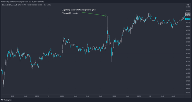 During $BITO’s listing, the price of BTC futures contracts on CME spiked, giving rise to a significant premium against Bitcoin’s spot price. However, that quickly corrected as traders stepped into arbitrage. More specifically, arbitrageurs were incentivized to buy Bitcoin while simultaneously selling BTC futures contracts. As a result, real buying pressure was introduced, albeit for a short period of time until the prices converged to trading equilibrium.