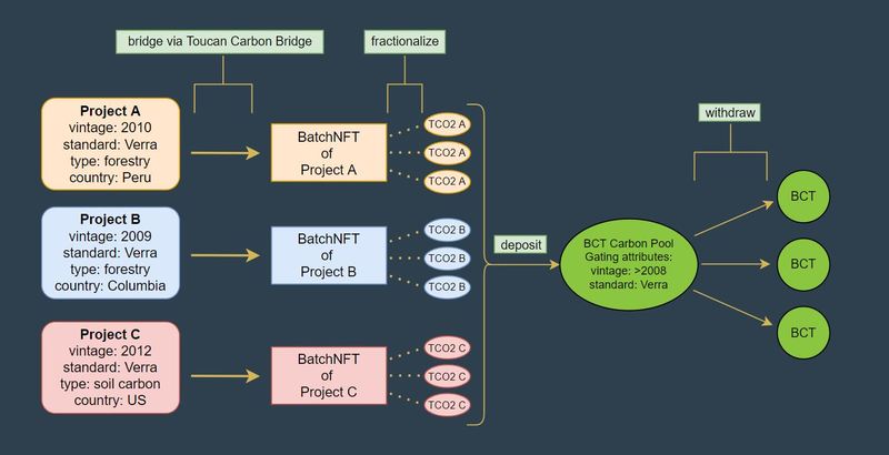However, these fungible TCO2 tokens still contain metadata referring to the BatchNFT in which they originated and are thus still not very liquid. To solve this, ‘carbon pools’ are created to deepen liquidity. These pools possess gating criteria which allow TCO2 meeting specific criteria to be deposited. Depositors then receive fungible ‘carbon reference tokens’ such as the BCT in exchange, which represent 1 carbon token from the carbon pool.