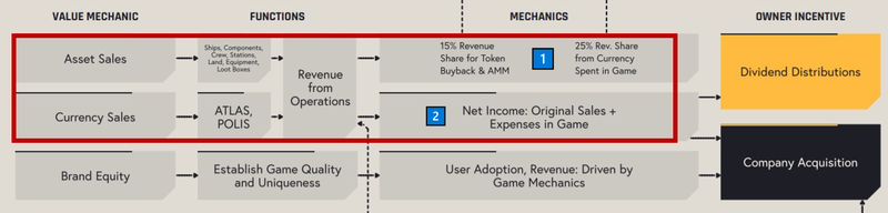 According to the Value Matrix of Star Atlas white paper, a portion of revenue from operations (derived from asset sales and currency sales) will be allocated to token repurchase & burn mechanisms (refer to 1), while the remainder will be calculated into net income and distributed as dividends (refer to 2).