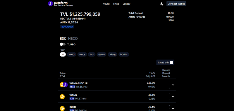 For example, Autofarm provides yield by continuously compounding the underlying deposits via the emission of AUTO tokens. On the other hand, ACryptoS only compounds the underlying deposits automatically, therefore not requiring any harvesting.